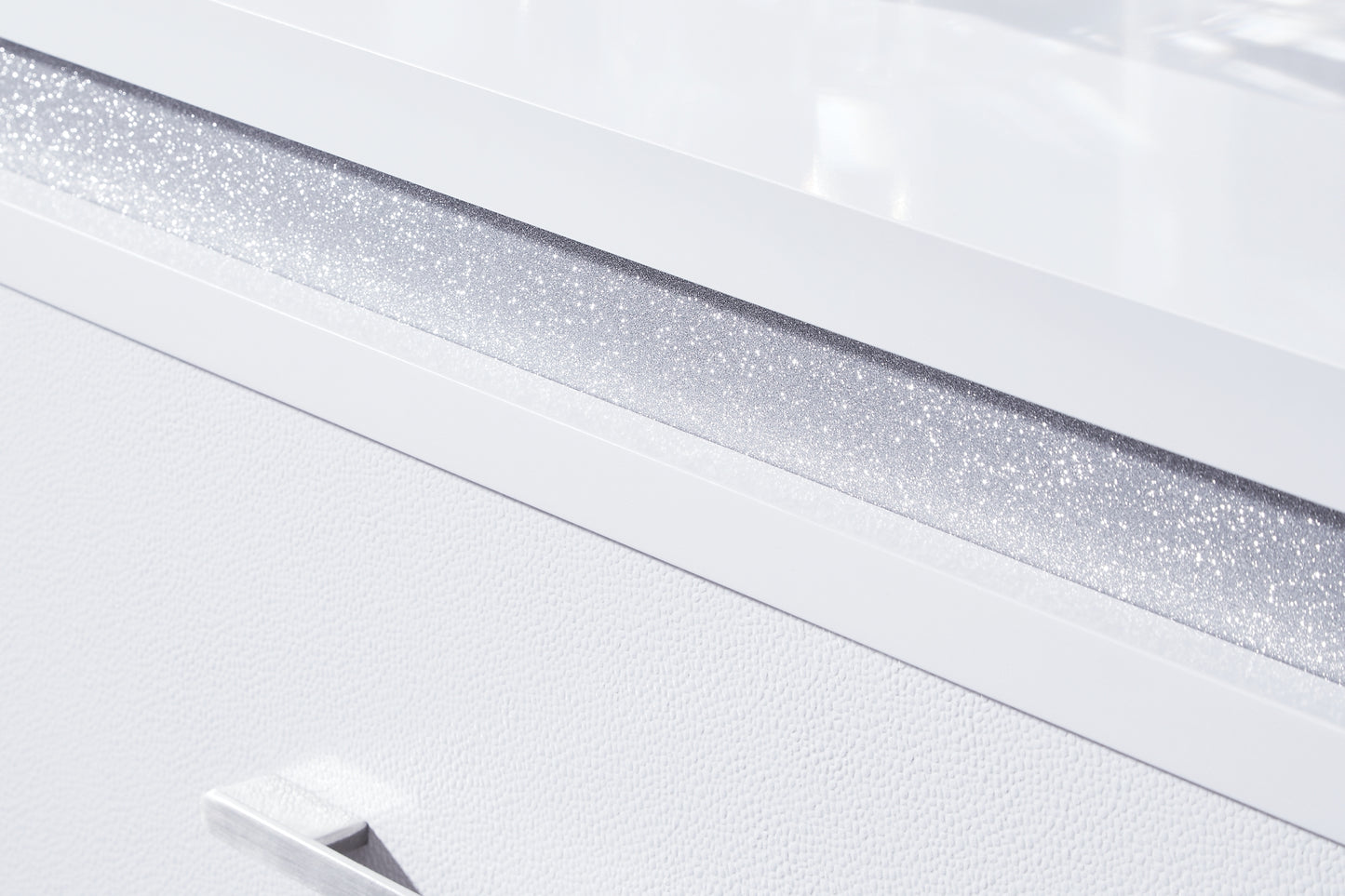 | Details | Made with hardwood solids and MDF substrates, White paint finish, Inset acrylic glitter accents, Horizontal metal drawer pulls, 2 drawers with fully finished interiors, dovetail construction and heavy-duty ball-bearing side glides, Textured drawer fronts | |